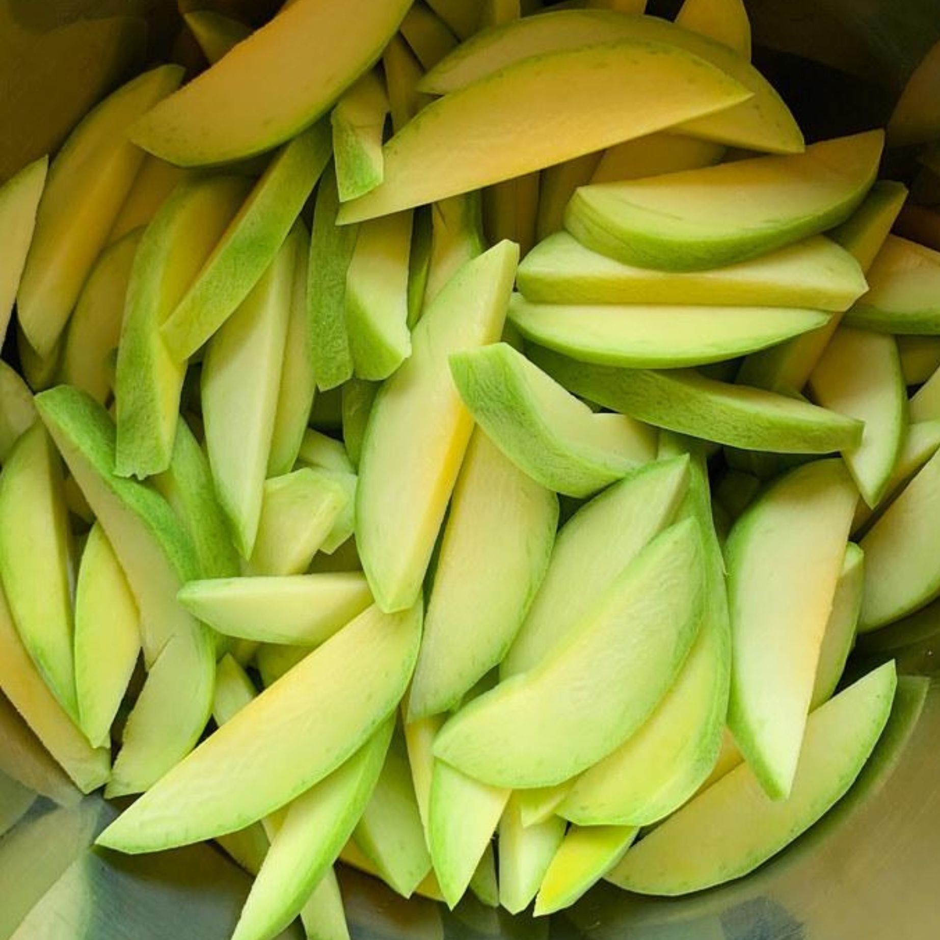 Frozen green mango is usually peeled, deseeded, and cut into uniform cubes.